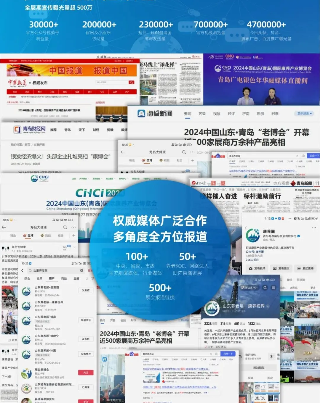 山东老博会扎根行业多年,在主流媒体、行业媒体乃至新媒体领域都建立了形式多样的稳固合作关系。博览会以专业媒体视角,帮助企业发掘产品爆点、定制立体式宣传方案,全展期宣传曝光量超500万。