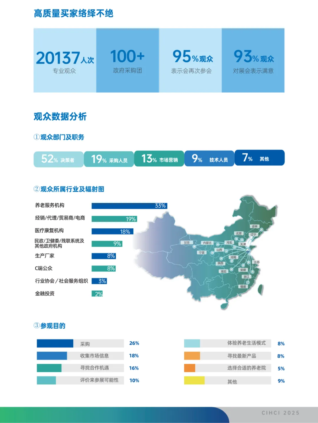 山东老博会已连续成功举办九届,拥有超100000精准专业买家资源库,观众数量和质量业内有口皆碑。作为行业一线博览会,博览会多年来得到山东省民政厅、中国社会福利与养老服务协会等众多权威单位的支持指导。每年邀请山东、内蒙古、河北、吉林、山西等全国各省市民政系统、养老协会的100+政府参会团和协会采购团到场参会洽谈。以高端前瞻性论坛汇聚机构、金融、保险等高净值人群,以多样性细分领域垂直会议、活动吸引行业协会、社会组织、一线从业者,更以万余种最新展品汇聚来自全国的运营商、贸易商、经销代理商以及一般消费者等。