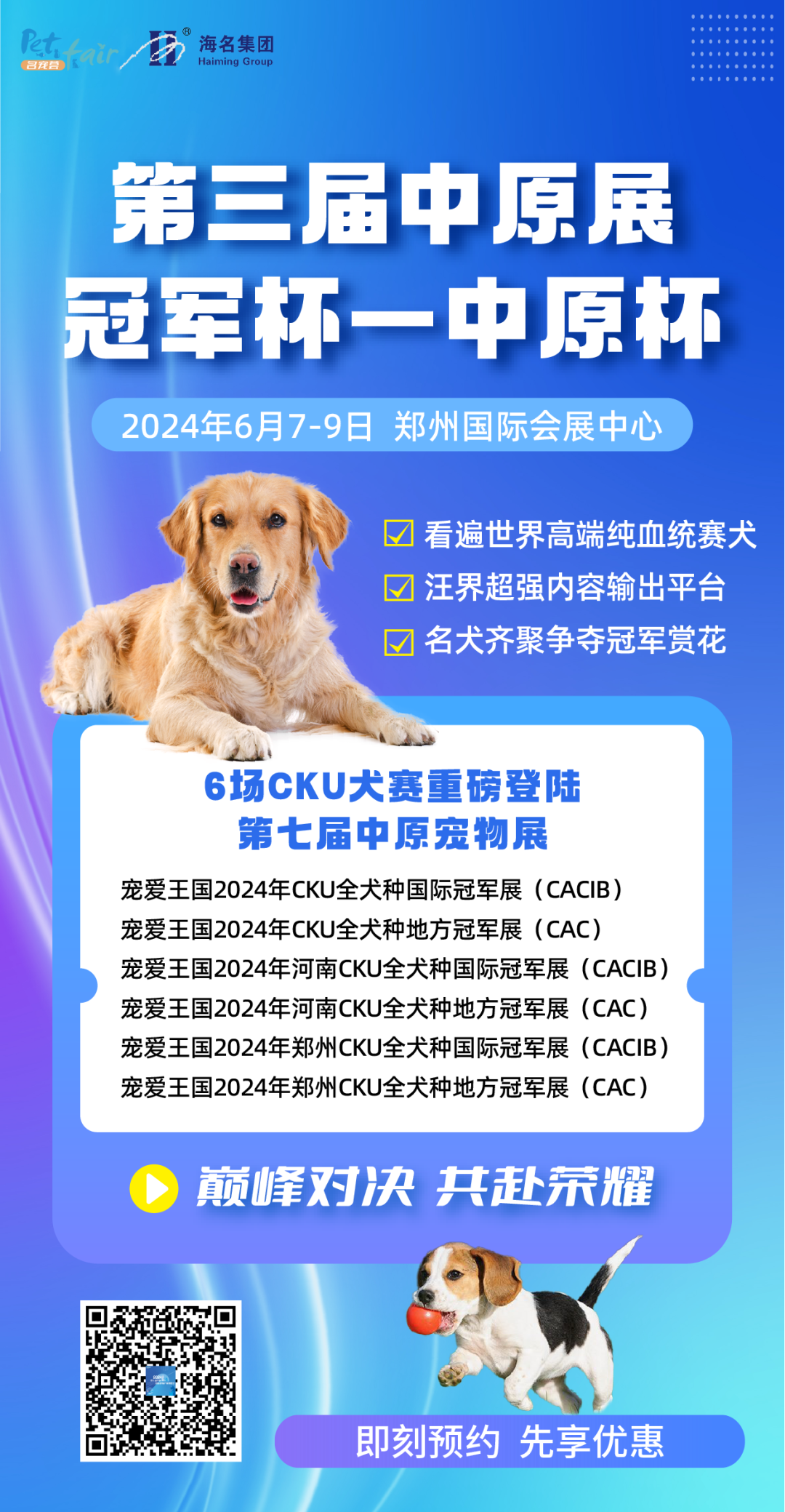 同期将有6场CKU全犬种冠军赛联袂登陆中原宠物展,巅峰对决,共赴荣耀。