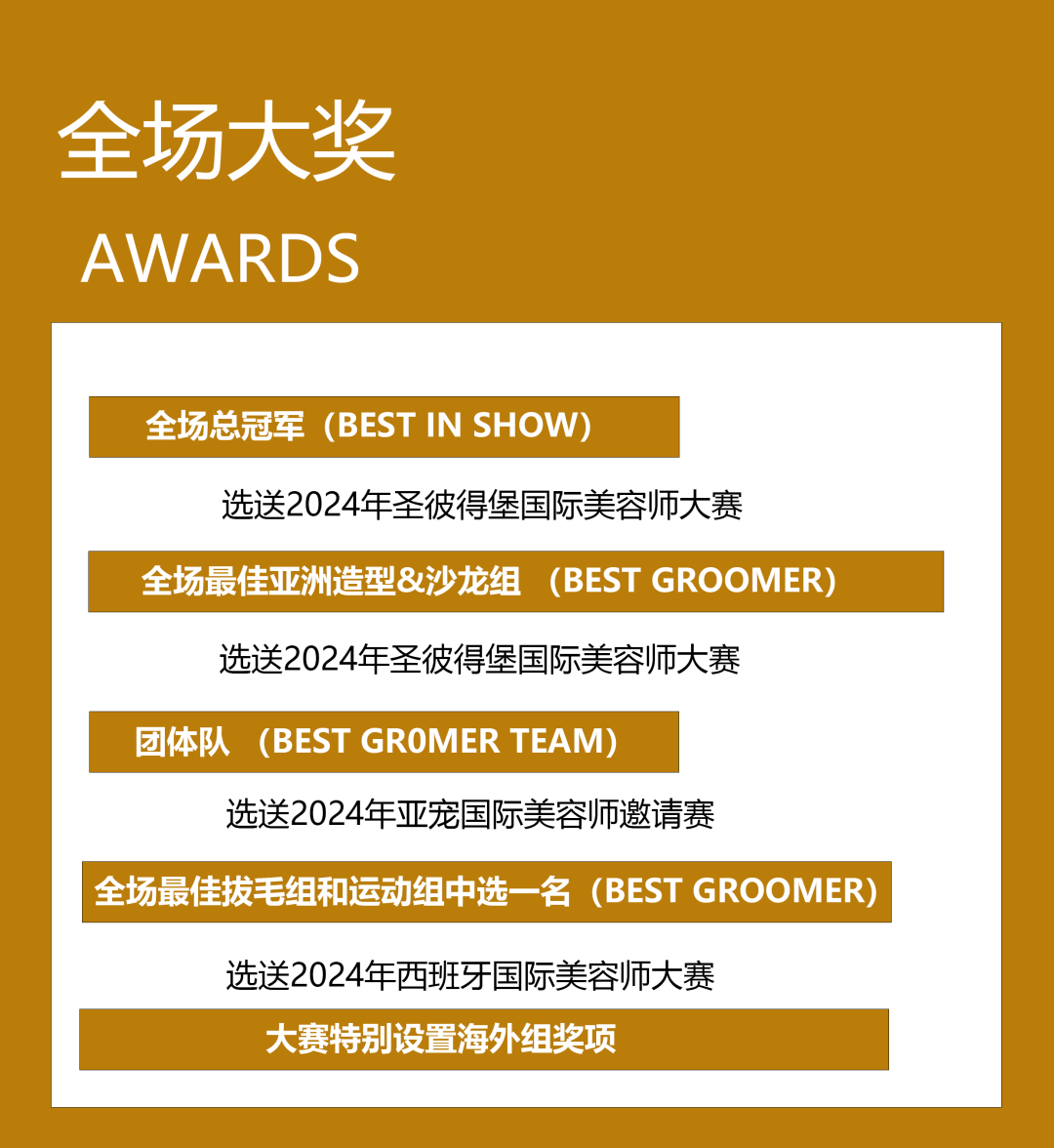 参加冠军组的选手必须为曾经在国内外任意宠物美容师比赛中赢得过冠军的美容师。