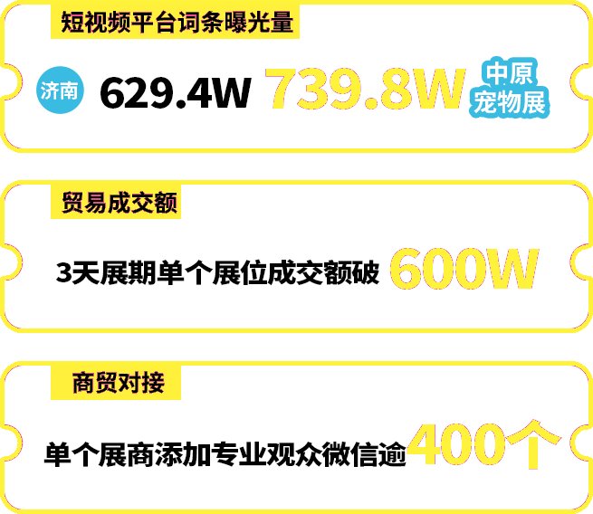 今年6月7-9日结束的第七届中原宠物展,3天展期共接待超8万+观众人次,刷新历史记录,重燃宠业热潮。高效的邀约战绩、可观的成交效果,斩获展商和观众连连称赞,商贸匹配再攀新高峰。