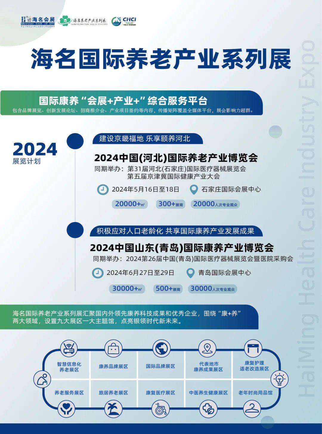 2024中国(河北)国际养老产业博览会(河北老博会、养老展、康养展、老龄产业展、智慧养老展、旅居养老展、养老康复医疗展、医养结合展、老年用品展)将于2024年5月16日-18日在石家庄国际会展中心举行。2024中国山东(青岛)国际康养产业博览会(山东老博会、养老展、康养展、养老服务展、适老家具展、老年护理展、智能看护设备展、适老科技展)将于2024年6月27日至29日在青岛国际会展中心举办。