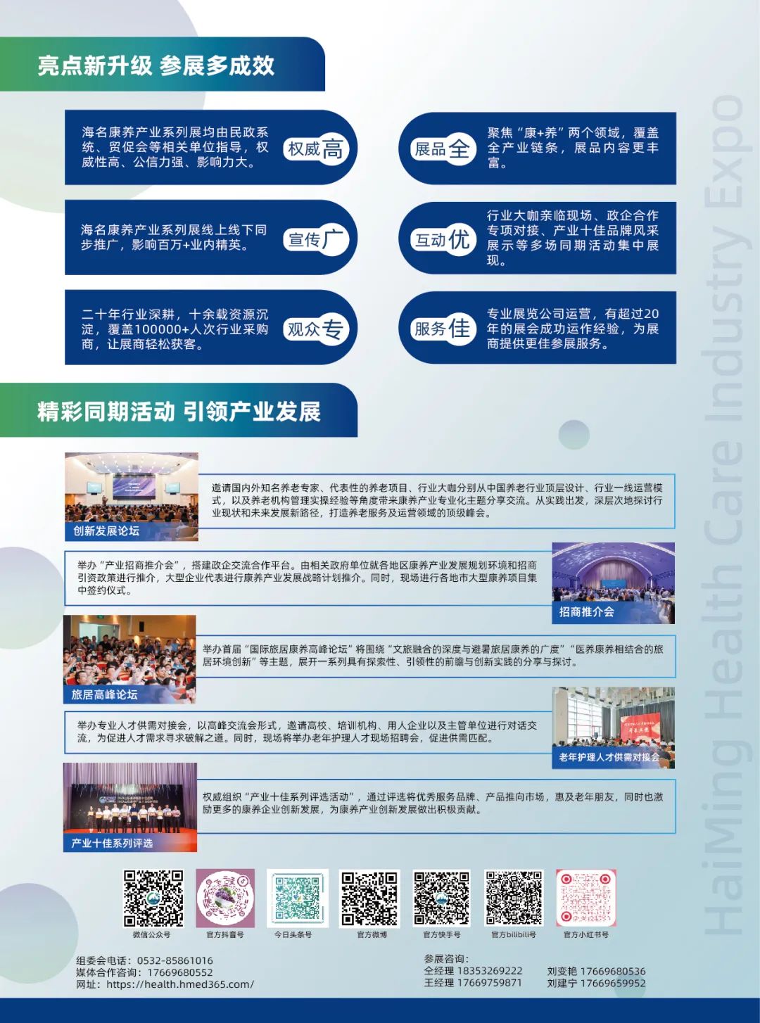特别福利:博览会组委会大力欢迎康养产业上下游企业,包括各地市养老机构、康复护理机构、残疾人托养机构、医疗卫生机构、科研院校、行业协会、慈善机构等组团参观本届展会,组委会将为您提供组团现金红包大礼,组团人数越多,现金红包越大!组团详情请联系:0532-85861016