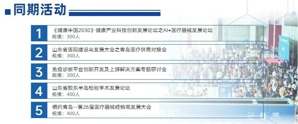 中国(青岛)国际医疗器械展暨医院采购大会已联展25届,以“最具效果医疗展” 著称,致力于打造医疗器械全产业链的产品技术、服务贸易创新、学术交流为一体的行业综合服务平台。是山东各级医疗机构的定点采购基地,也是展商树立品牌形象,拓建山东及北方医疗市场,商贸洽谈、订货交易的绝佳平台。
